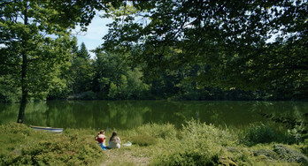 Deux jeunes femmes profitent du cadre sauvage d’un lac isolé. C’est une journée ensoleillée.